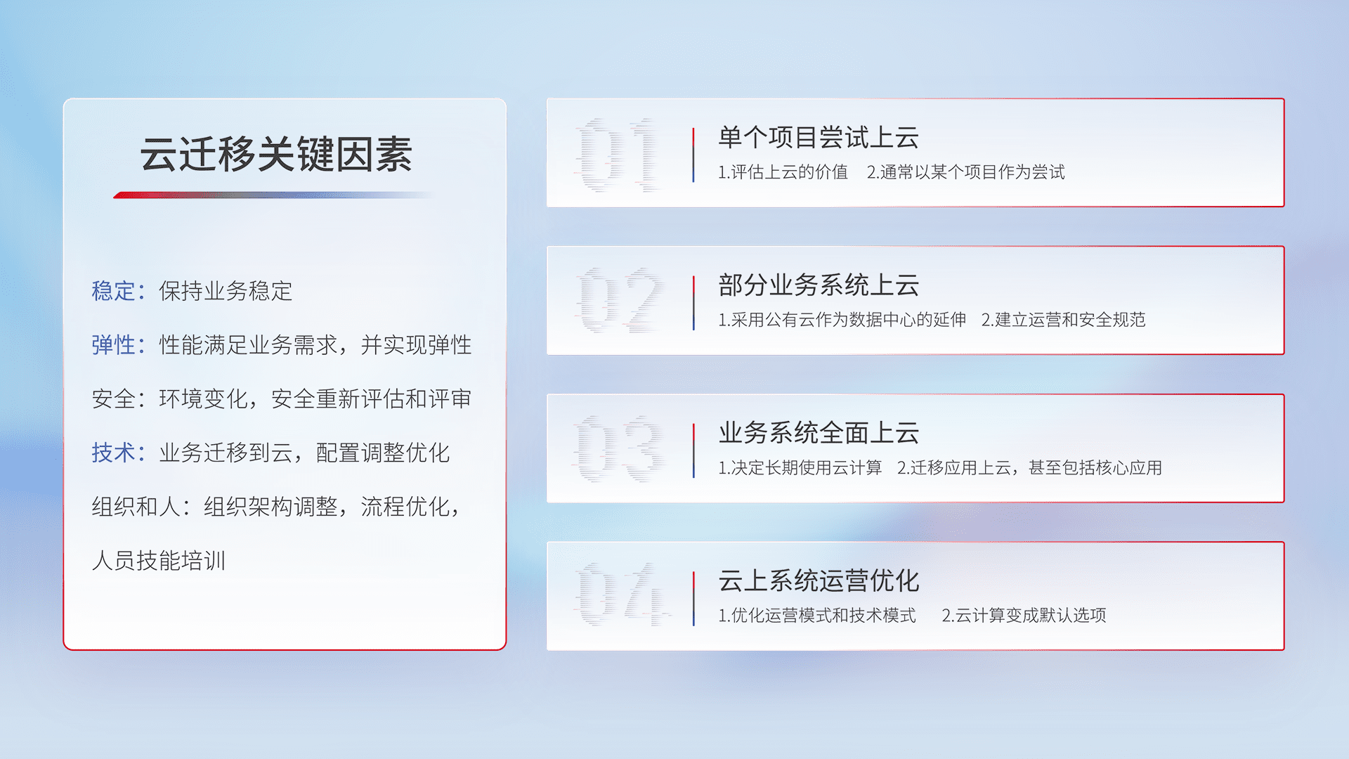 结合实际业务,,,从规划设计、、、、云平台选型、、、、云原生改造、、、数据迁移、、、、集成交付,,迁移全过程为客户识别最佳上云路径,,做好风险识别管理,,,设计网络架构、、、身份权限、、、安全审计合规、、、操作审计、、、、日志审计、、、监控告警策略、、多站点容灾设计等,,,,对云上基础设施进行整体规划,,提升IT治理水平,,,,以满足弹性、、高可用、、、高性能的需求。。